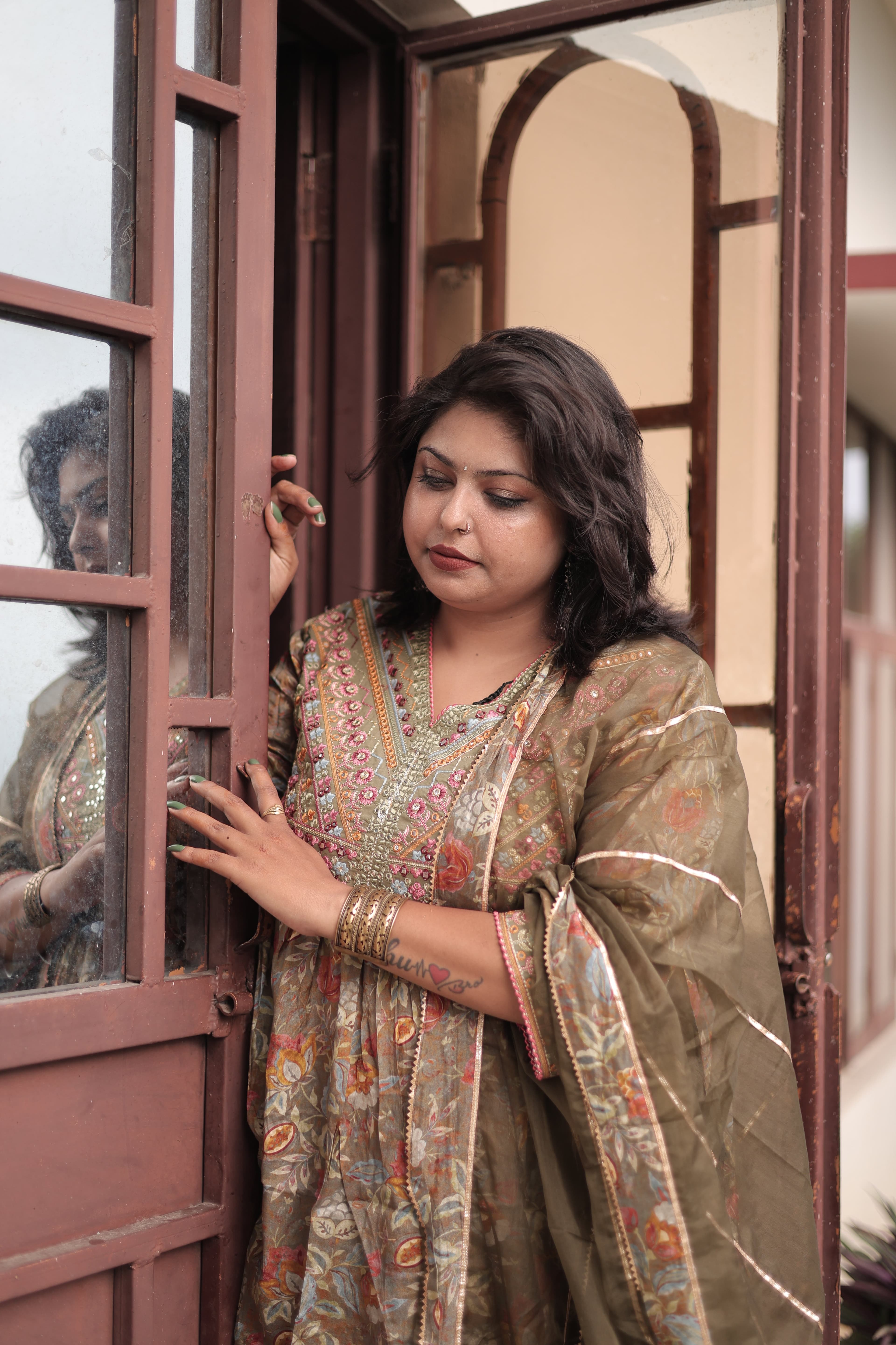 Women Printed Flared Anarkali Kurta with Pant & Dupatta Suit Set (Fully Stitched, Ready to Wear)