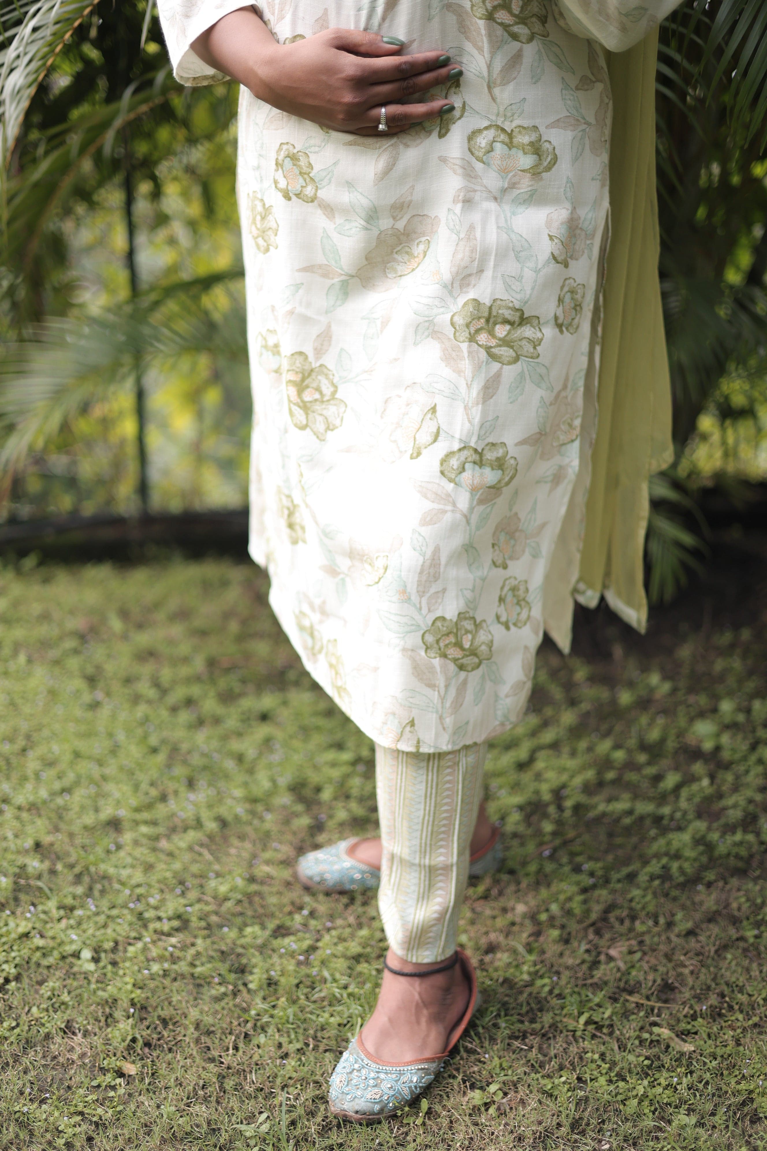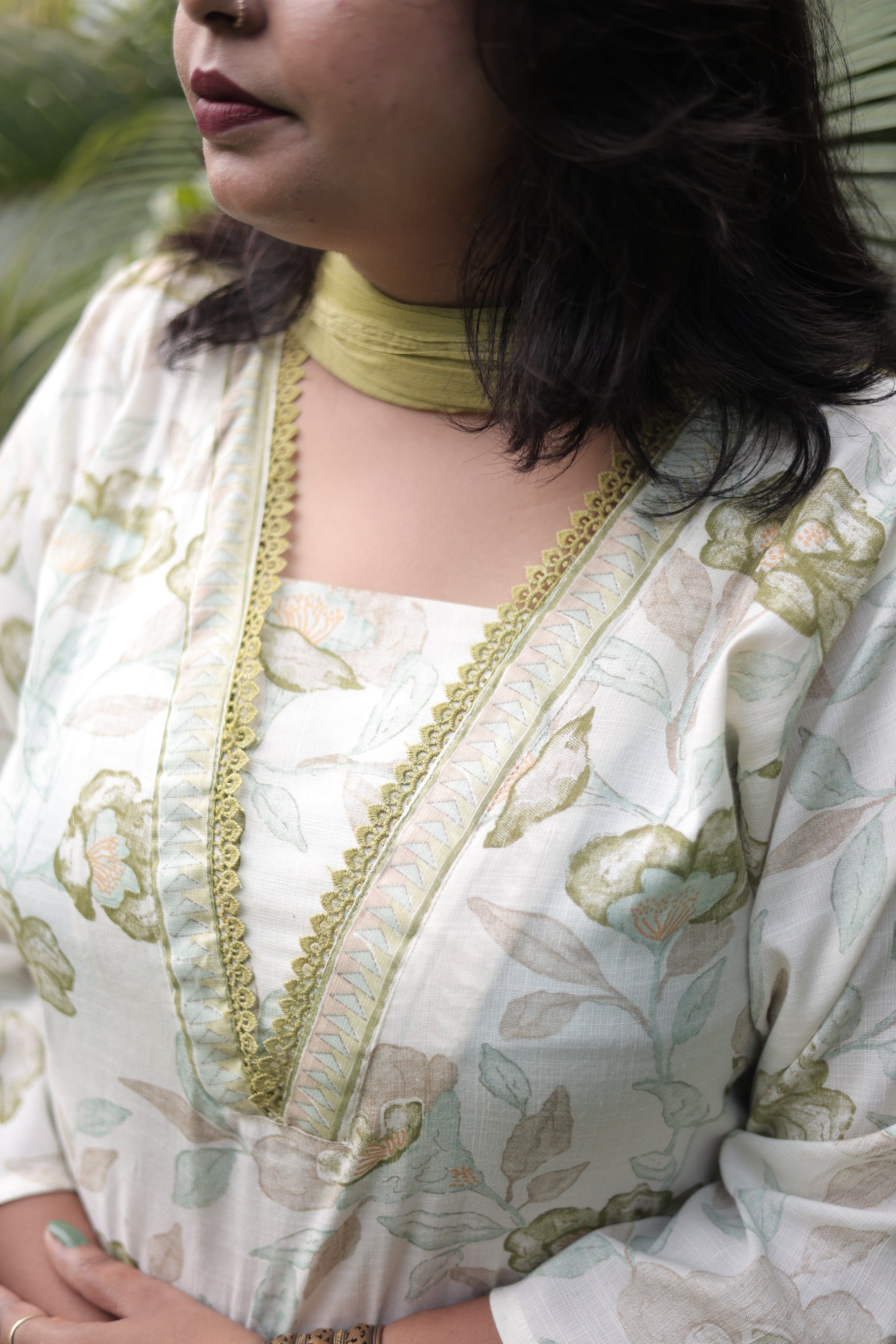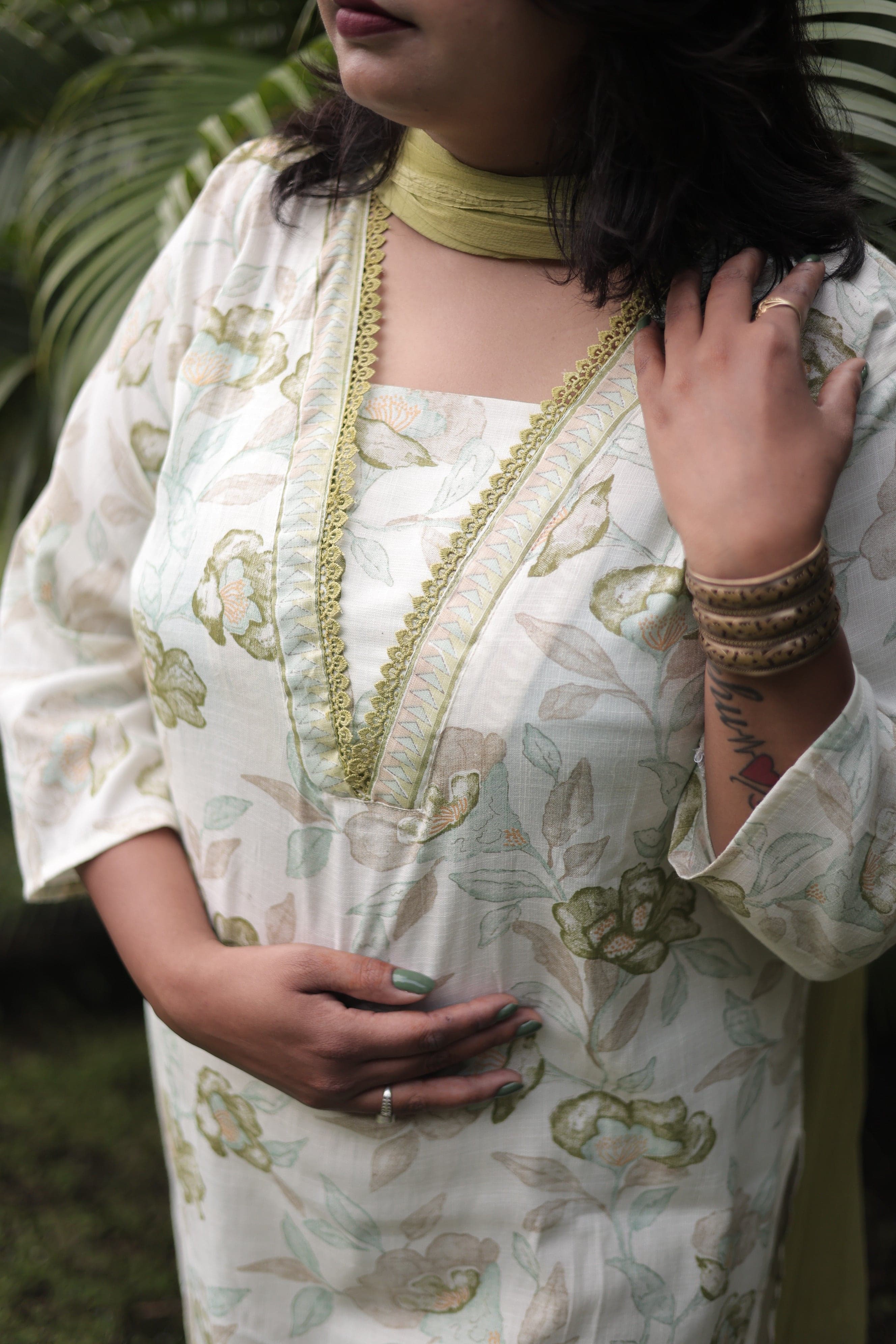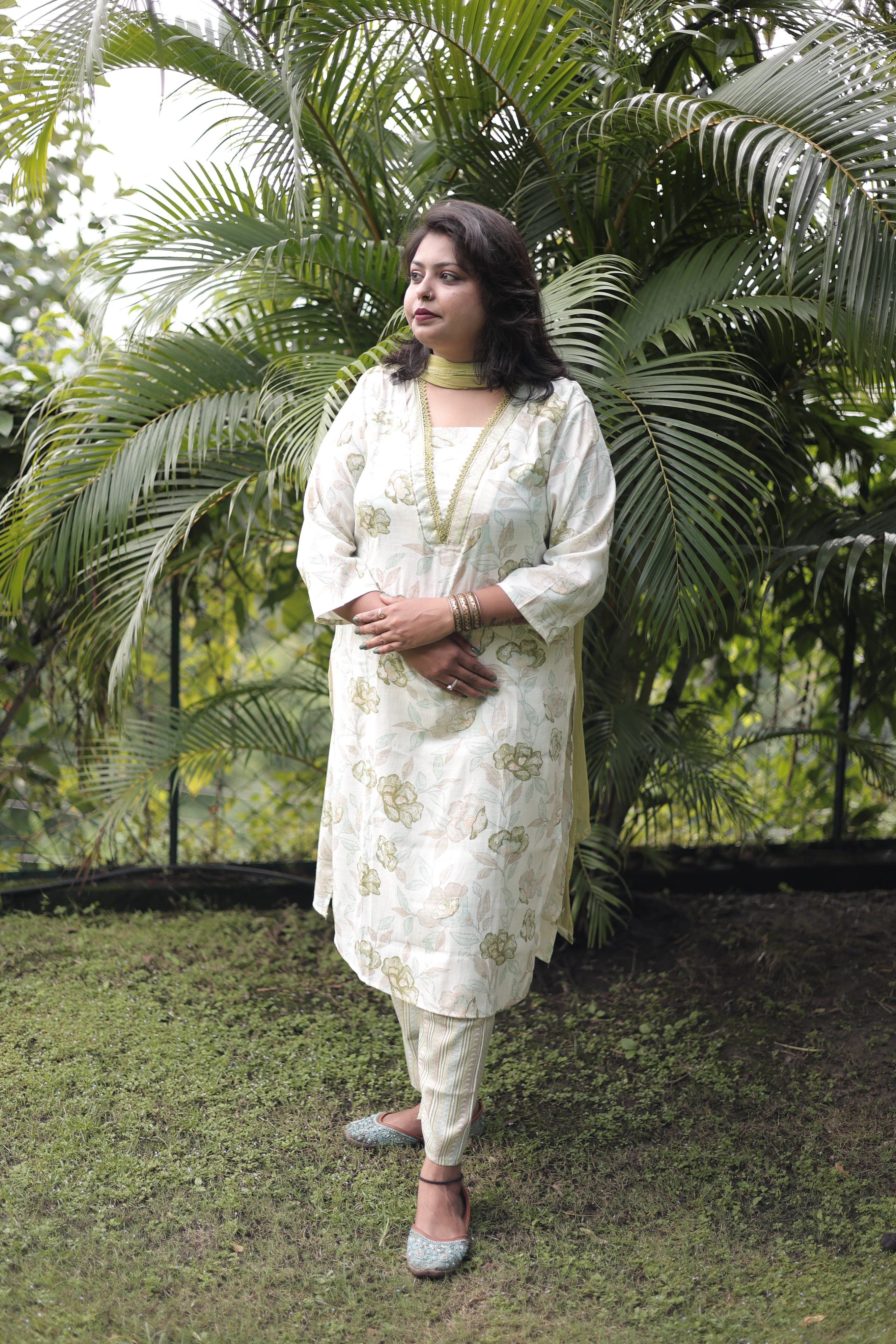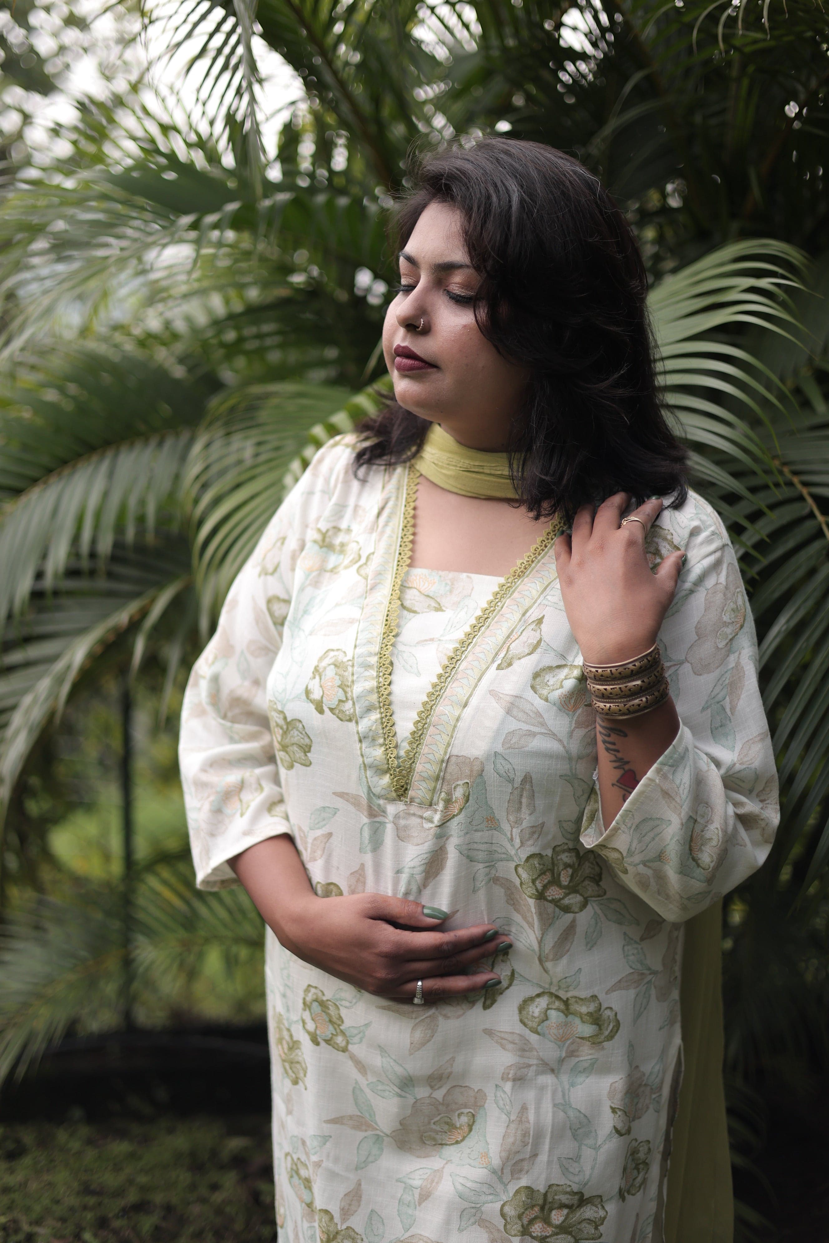 Cream Green Stylish V Neck Kurta with Pant & Dupatta Set (Fully Stitched, Ready to Wear)