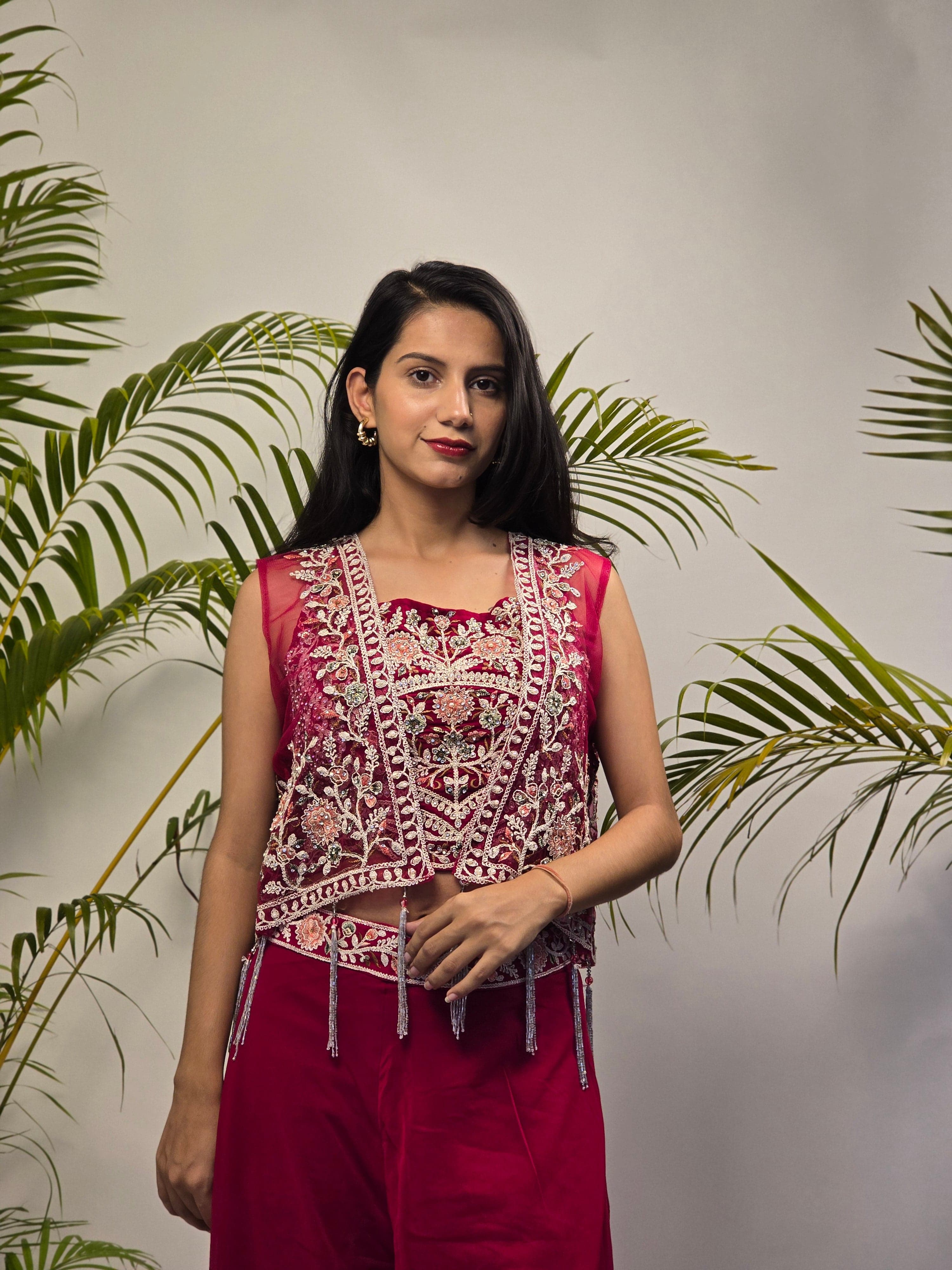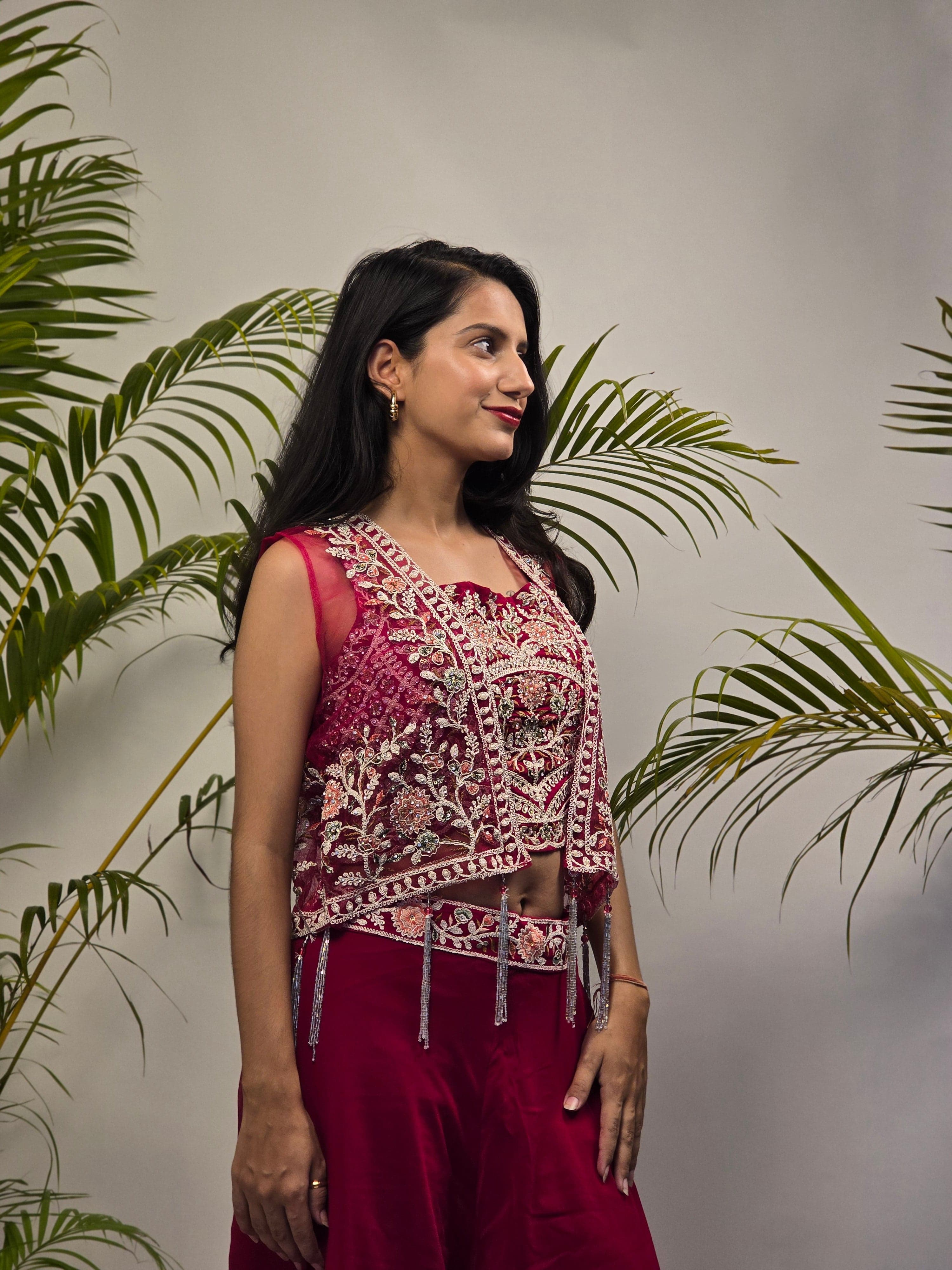 Velvet Rose Maroon Embroidered Indo-Western Crop Top Palazzo Set