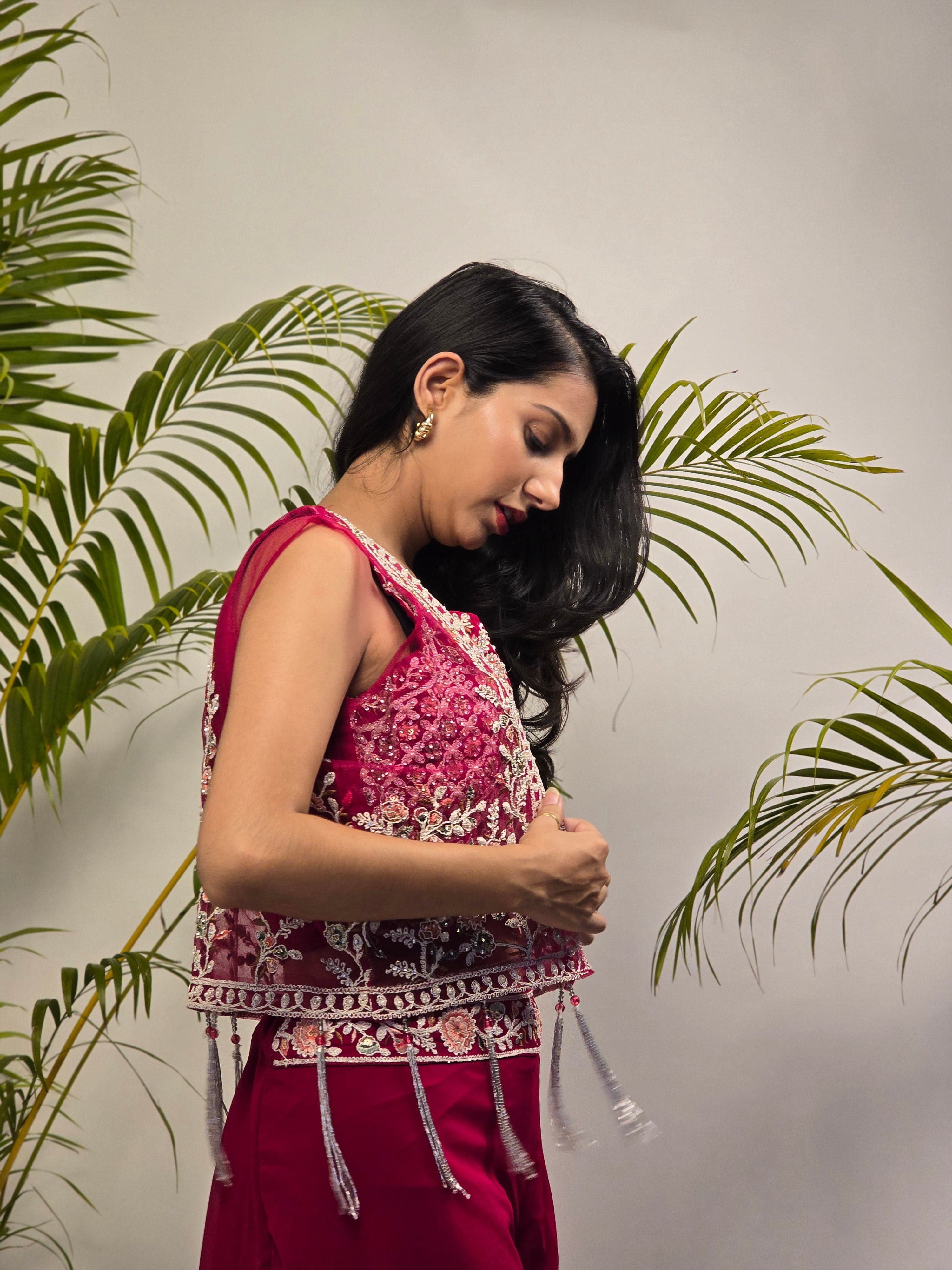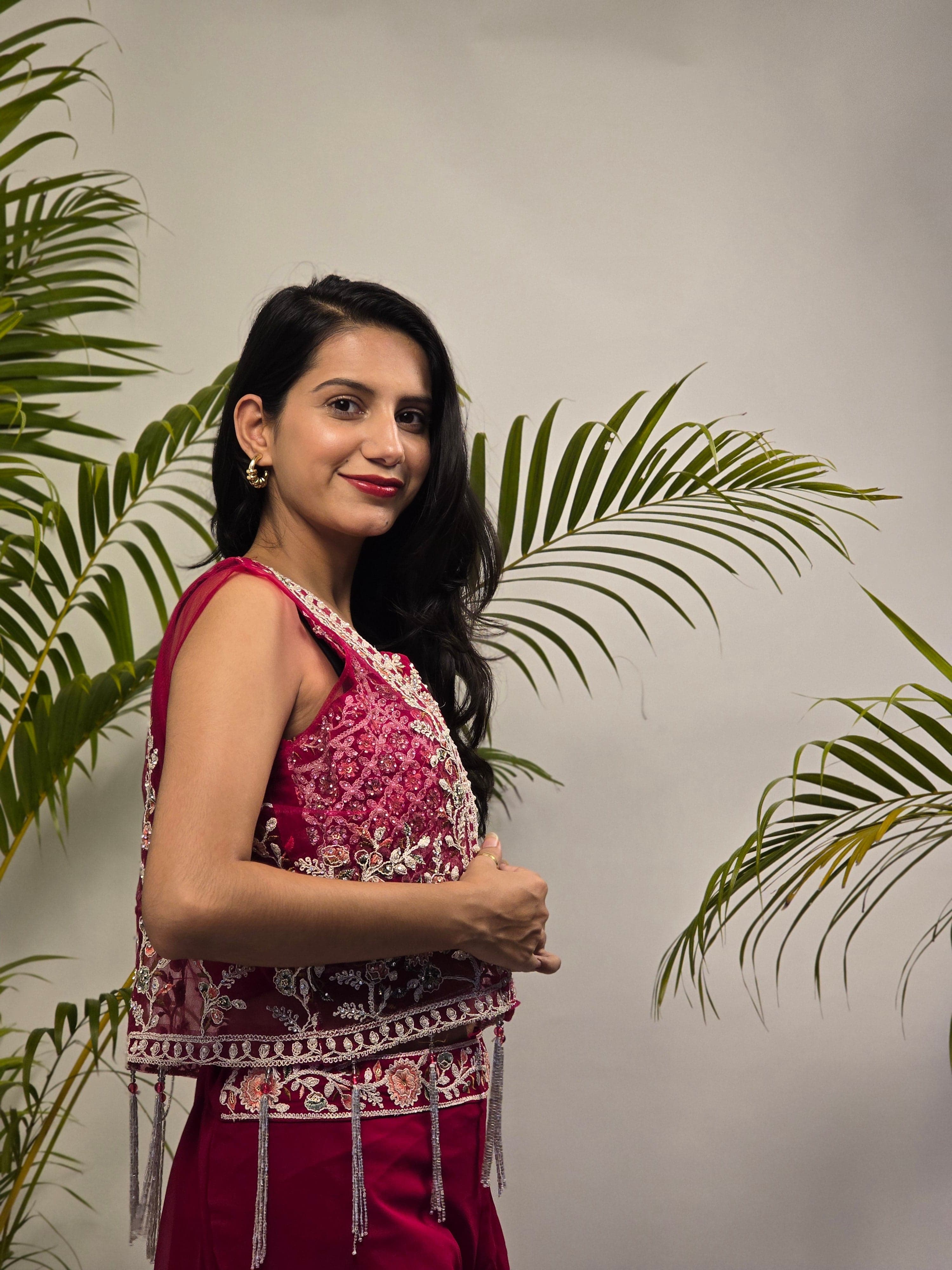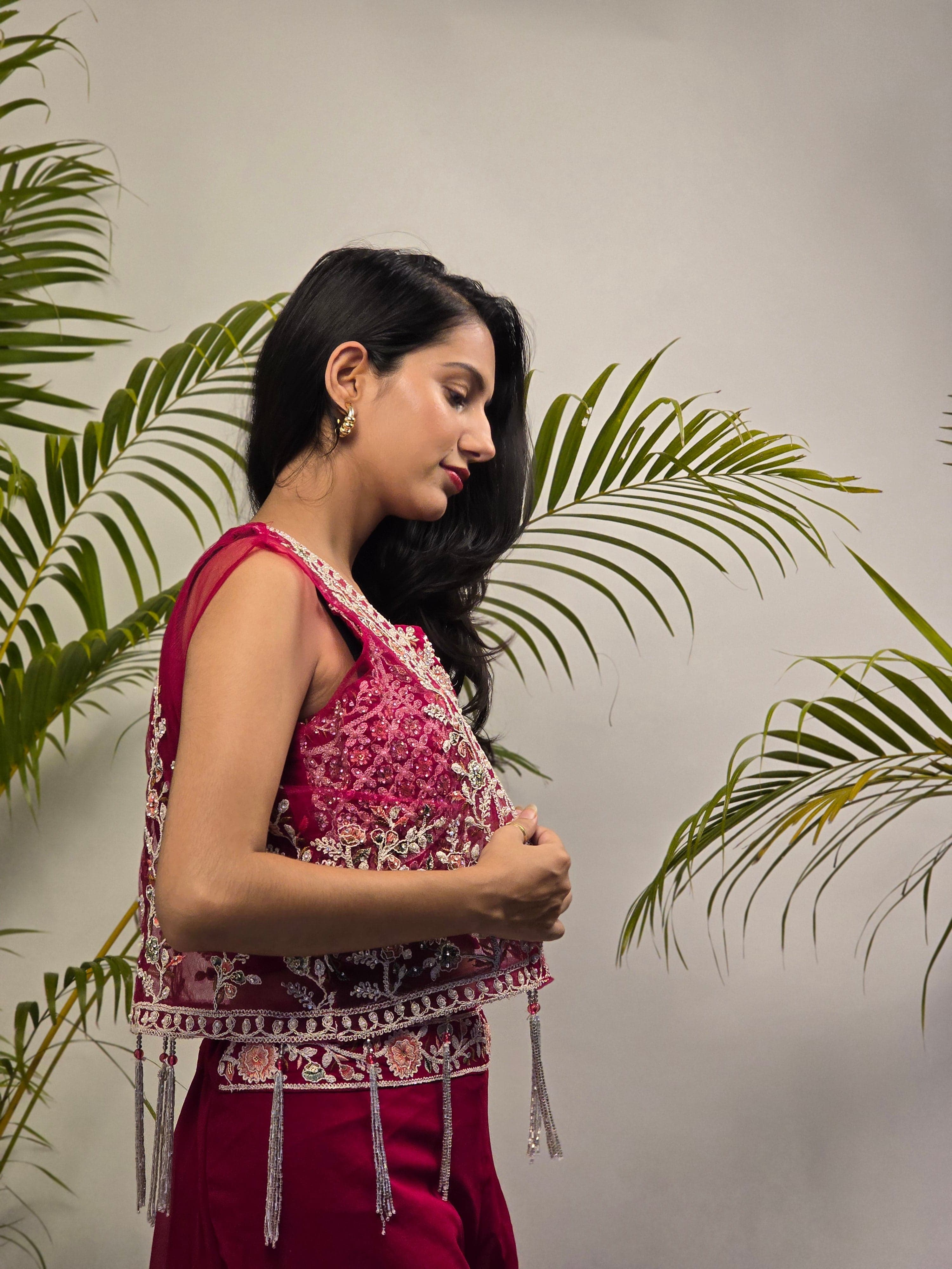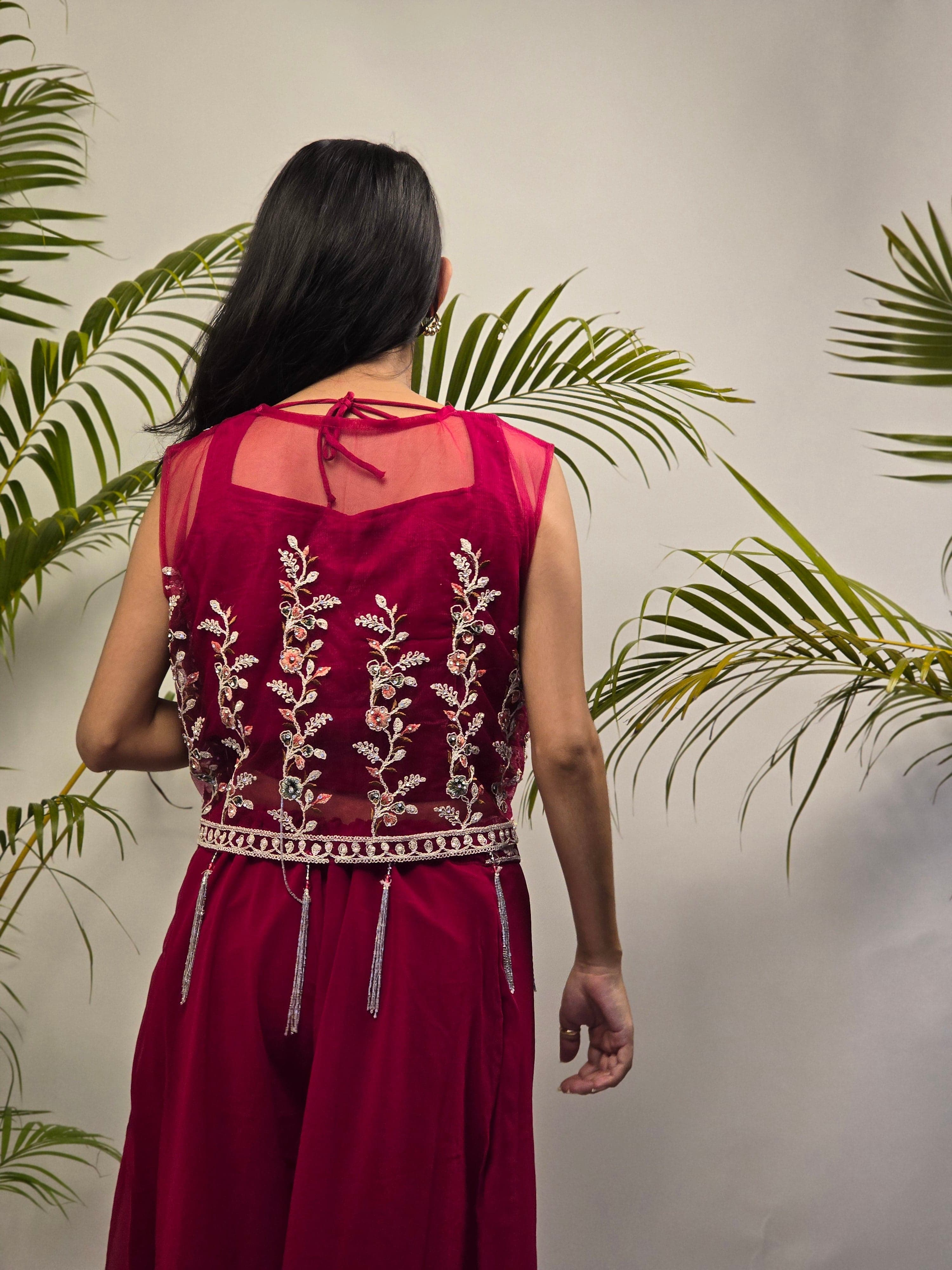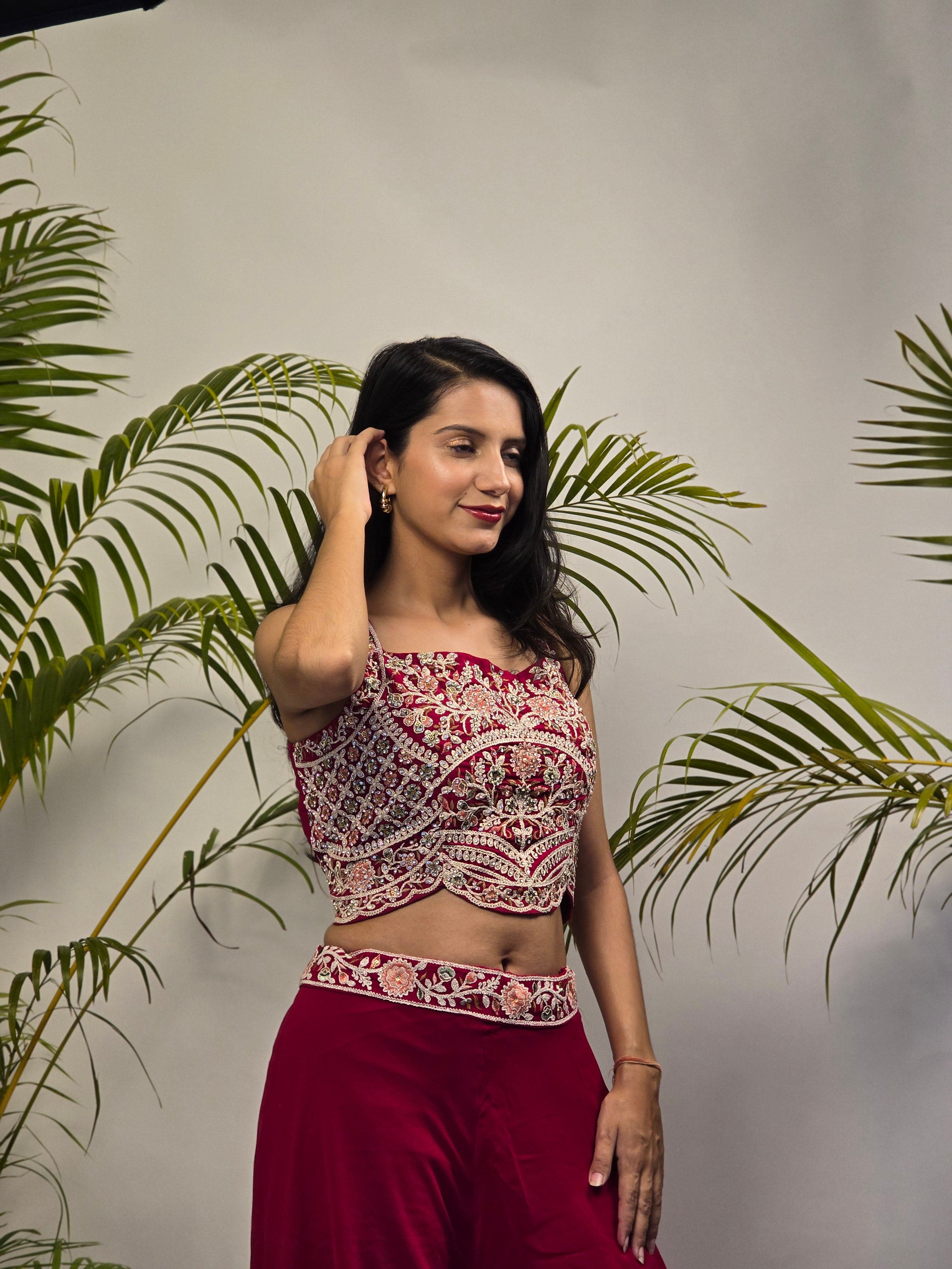"Velvet Rose" Maroon Embroidered Indo-Western Crop Top & Palazzo Set